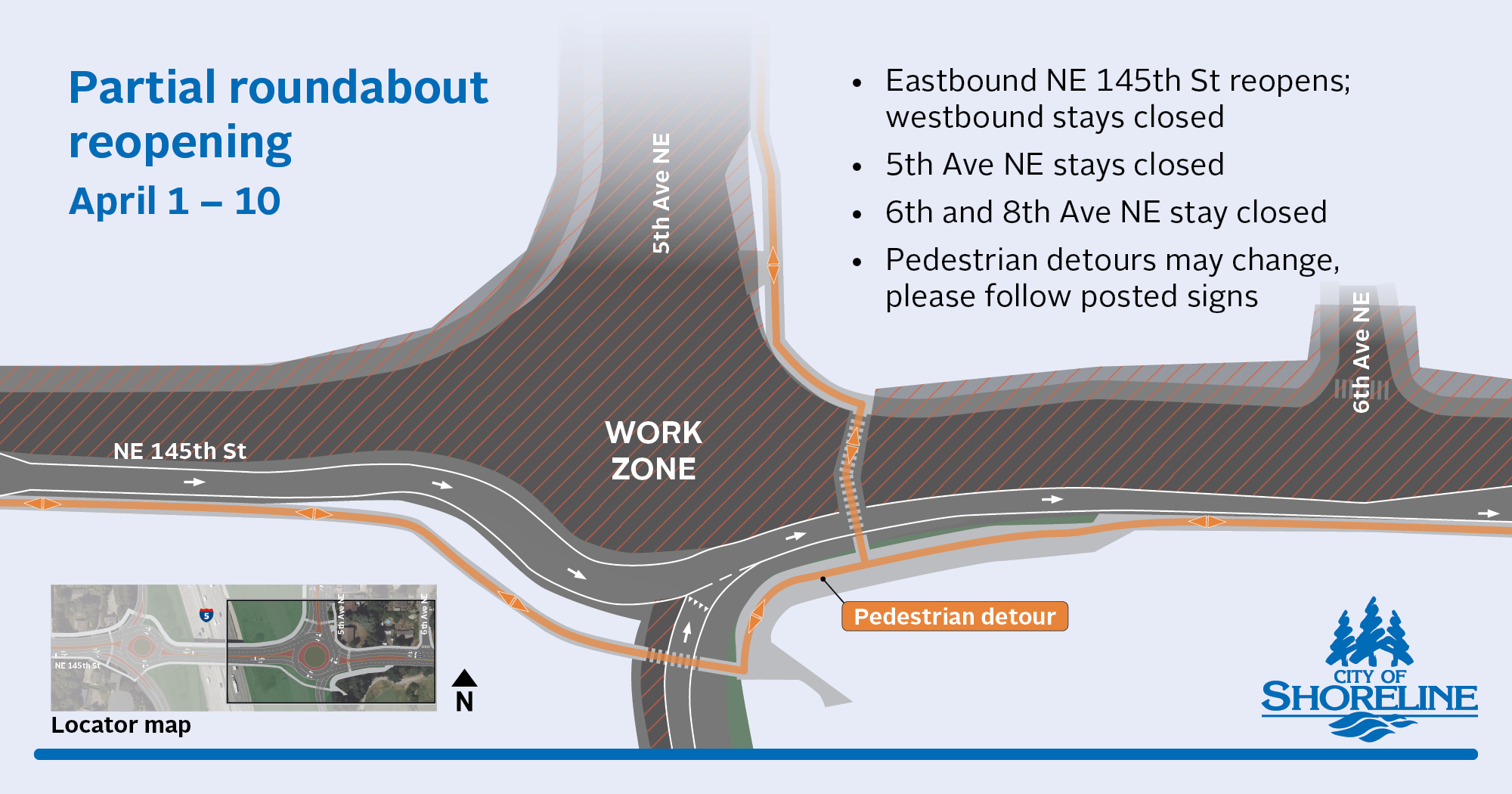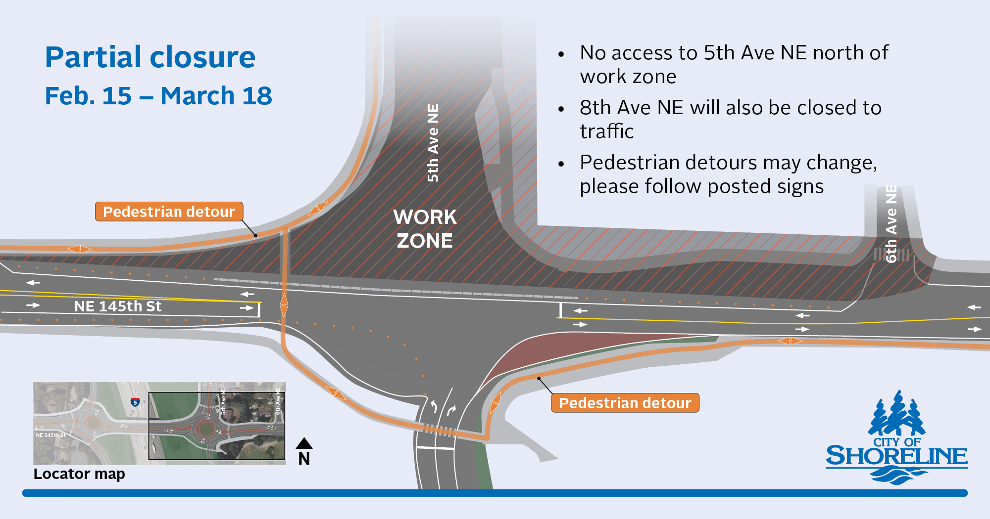 5th Avenue NE between NE 145th Street and the northbound I-5 on-ramp is now closed through April 10 as construction crews build out the new roundabout on the east side of the overpass. The northbound I-5 off-ramp to NE 145th Street will remain open through March 18. 6th Avenue NE and 8th Avenue NE will remain closed to through traffic from NE 145th Street.