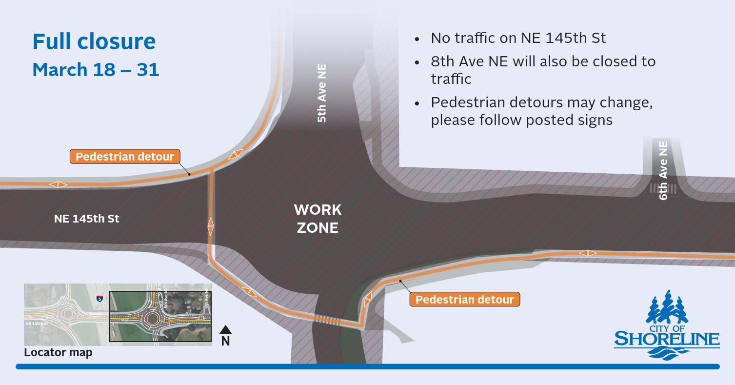 Crews will close the NE 145th Street and 5th Avenue NE intersection to all traffic from March 18 to 31. To set up the closure, crews will do overnight work in the intersection beginning at 9 p.m. Wednesday, March 18. The closure will allow crews to construct the new roundabout on the east side of the overpass. The following will be closed from the evening of March 18 to 31: