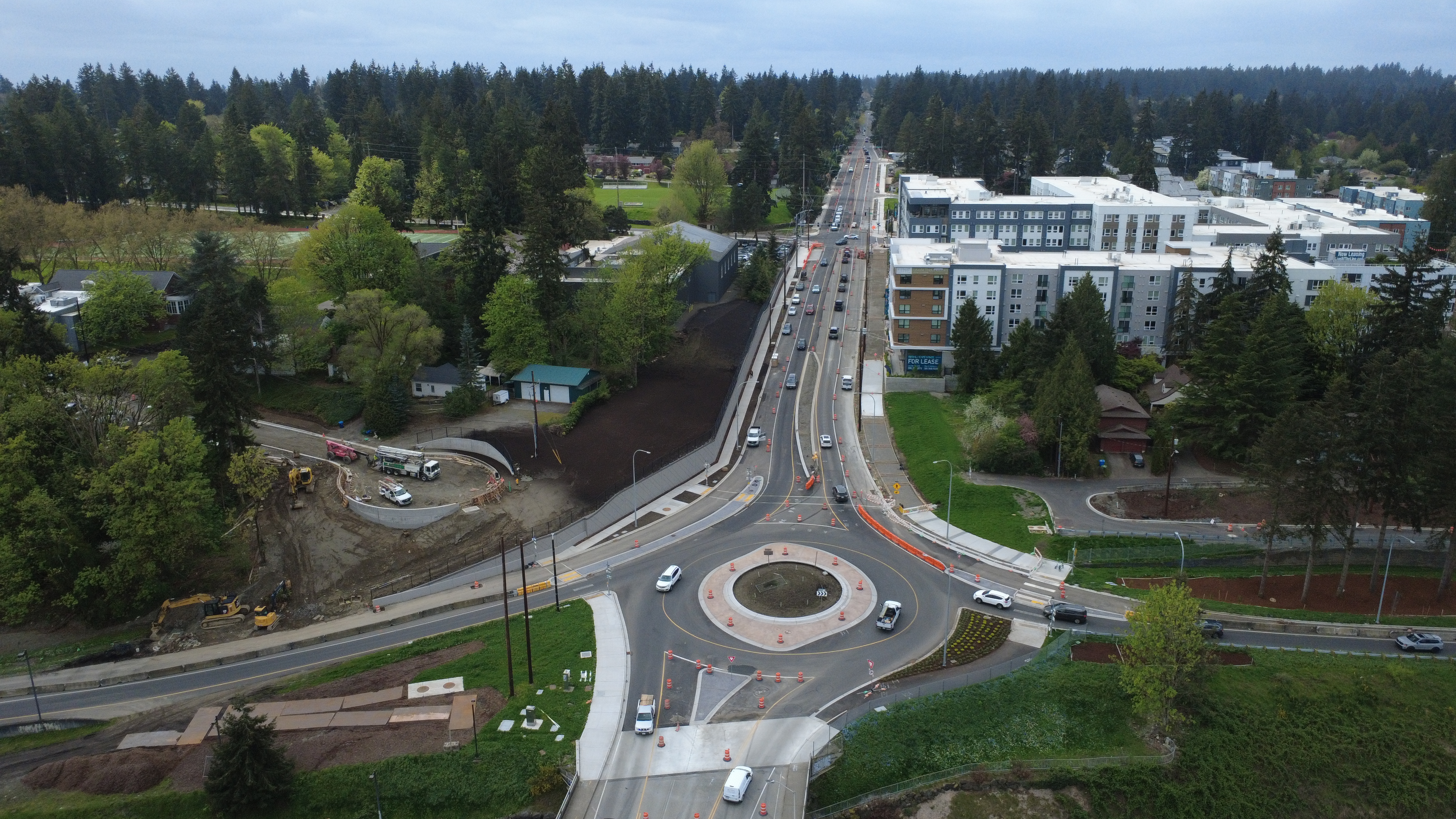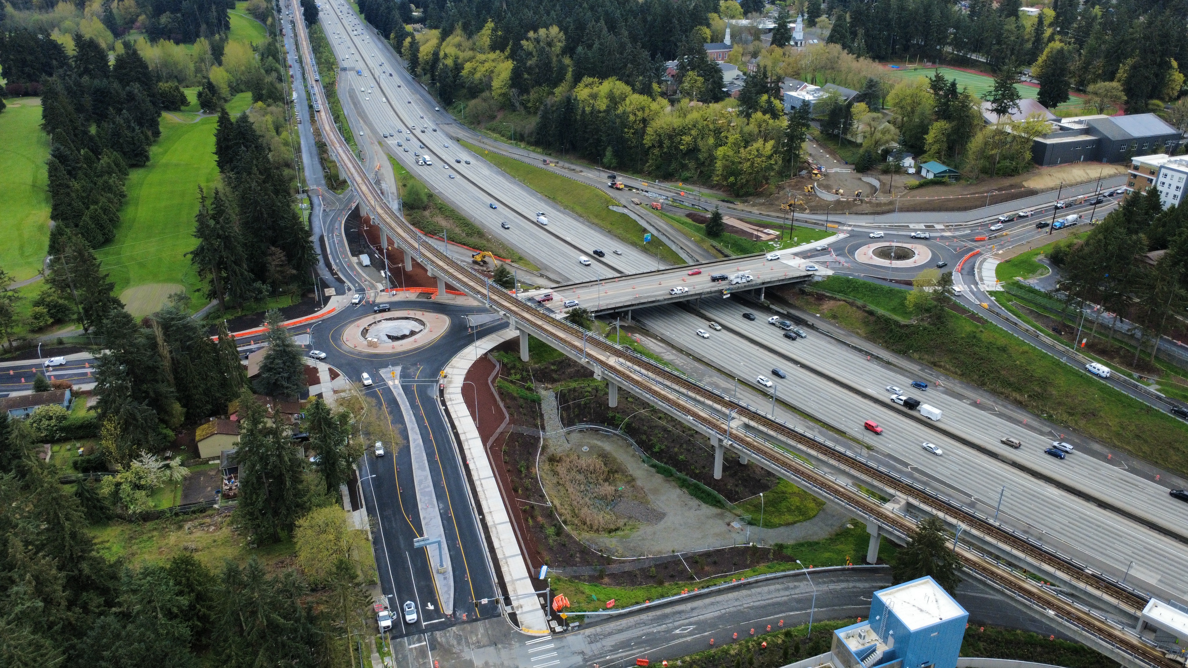 Crews opened the new roundabout east of the 145th Street overpass on Friday, April 10. This aerial image was taken from above 5th Avenue NE and faces south.