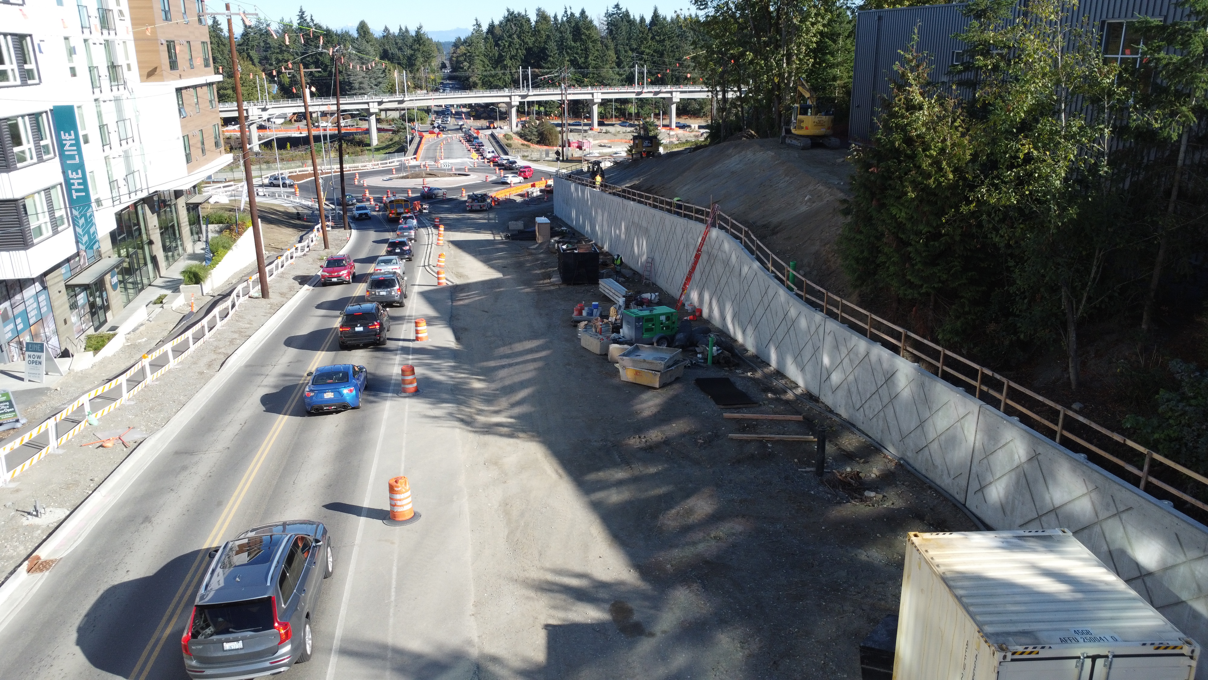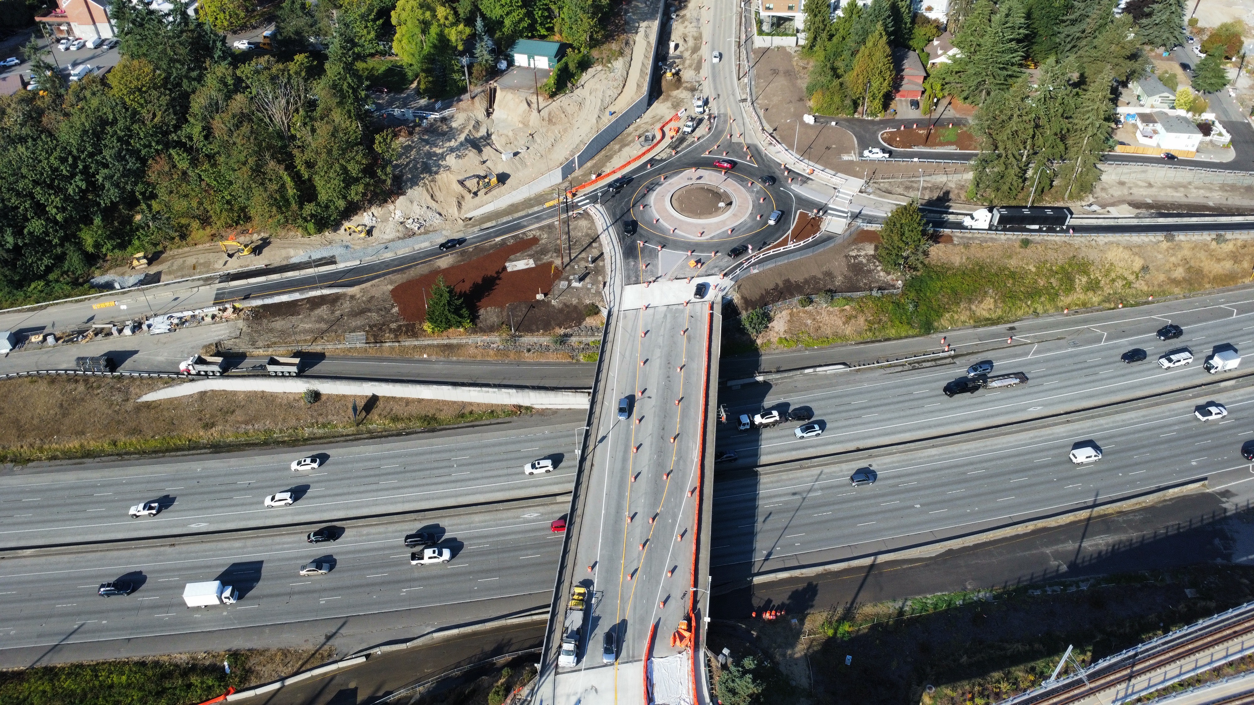 Travelers are now using the new roundabout in a temporary single-lane configuration on the west side of the N 145th Street overpass. The east side of the overpass will remain signalized until spring 2026 when another roundabout is constructed. Work will continue in the area, so please drive carefully and follow posted signs.