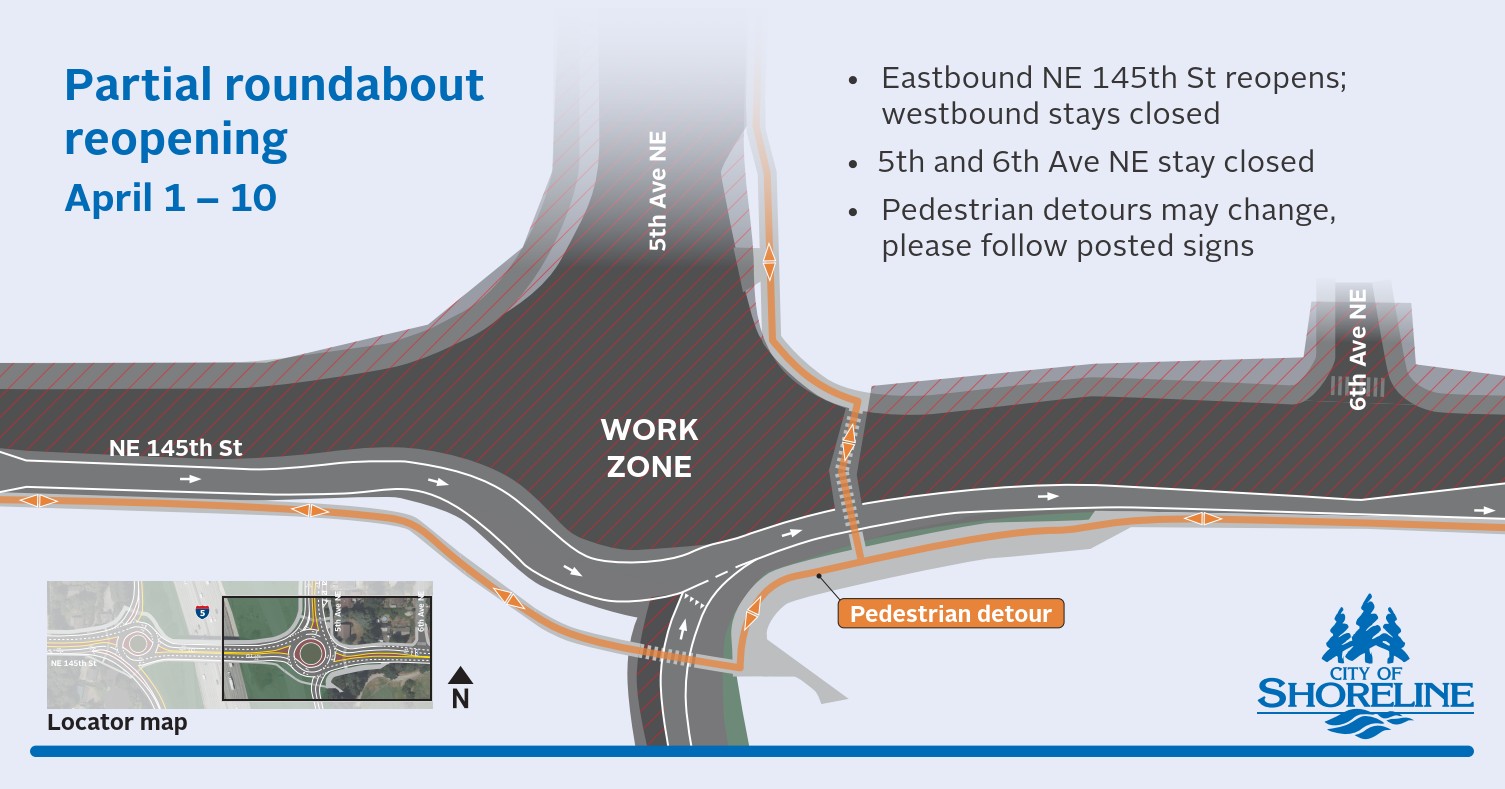 April 1-10: Eastbound 145th Street and northbound off-ramp reopen; westbound 145th Street and 5th Avenue NE stay closed